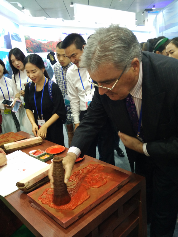 亚太旅游协会首席执行官顾问戴龙先生饶有兴致的体验制作夹江年画