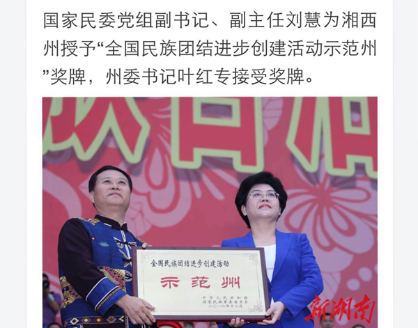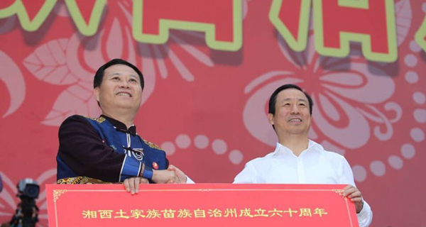湖南省委书记、省人大常委会主任、省祝贺团团长杜家毫在庆典会上说,60年来,在党中央、国务院的亲切关怀下,湘西自治州创造了令人瞩目的成就,发生了翻天覆地的历史巨变。中央有关部门祝贺团团长、国家民委副主任刘慧代表国家民委给湘西自治州授予了“全国民族团结进步示范州”称号。