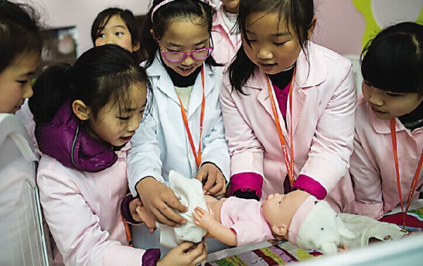 诺亚方舟儿童职业体验馆内,小朋友们一起为「小宝宝」做护理。