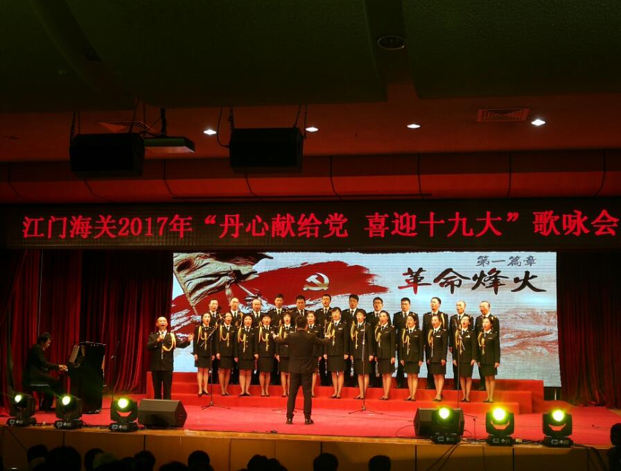 【香港商報網訊】記者盛芳齡、黃裕勇報道:為歡度建國68周年國慶,喜迎黨的十九大勝利召開,9月27日下午,江門海關舉辦2017年“丹心獻給黨 喜迎十九大”歌詠會。此次歌詠會共有12支參賽隊伍,全部由該關幹部職工組成,他們利用下班業餘時間進行集中排練,精心組織和積極准備,以黨的光輝曆程為主線編排選取合唱曲目,並配合詩朗誦、舞蹈、鋼琴配樂等多種文藝表現形式,歌頌黨的十八大以來取得的偉大成就,展現出廣大海關幹部職工以良好精神面貌迎接黨的十九大勝利召開的情懷和信心。