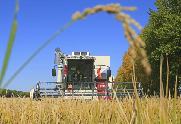 圖為機車正在進行收獲水稻時的情景。