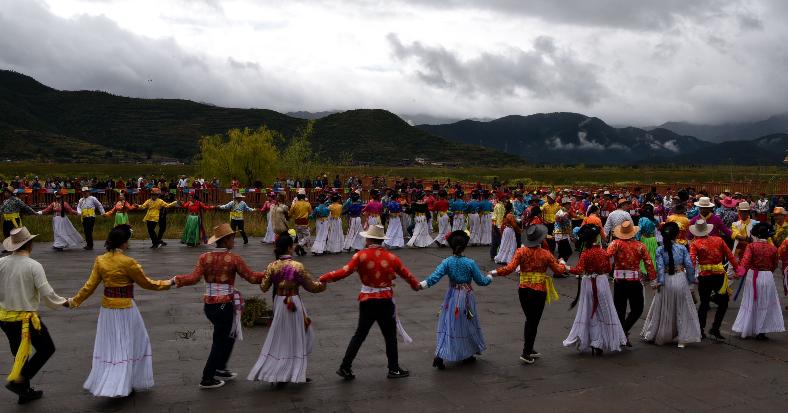 99对新人体验摩梭民俗文化手拉手跳甲搓舞。