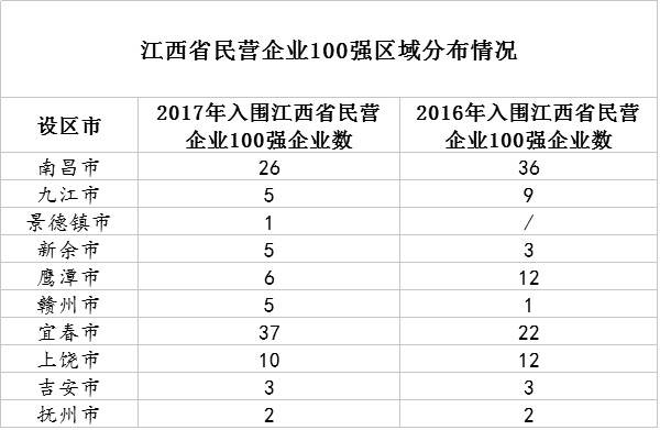 从地区分布看,2017江西省民营企业100强全省10个设区市有企业入围,其中南昌、宜春、上饶均超过10家,景德镇新入围1家,其中宜春37家,位列第一。