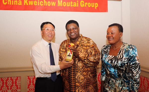 茅台集团党委书记、总经理李保芳向纳米比亚贸工部长恩加齐泽科赠送“走进非洲”贵州茅台酒