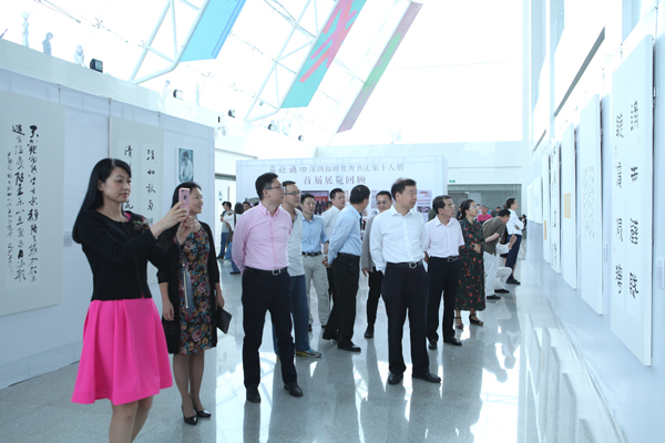 福田区委书记肖亚非,深圳市政府副秘书长、中国书协会员马伯寅,深圳市政府副秘书长刘佳晨,中国保监会深圳监管局副局长陈风,福田区文联主席刘国威,福田区文联副主席王云英观看展览