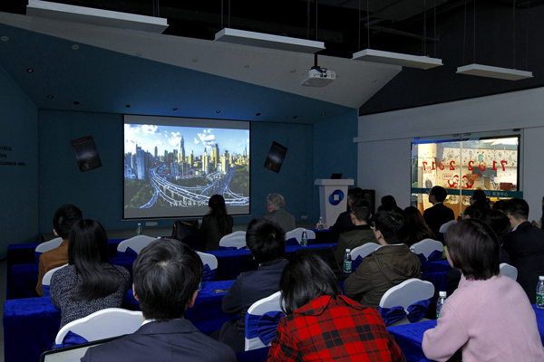 柯文思(中)与文艺爱好者观看预告片。