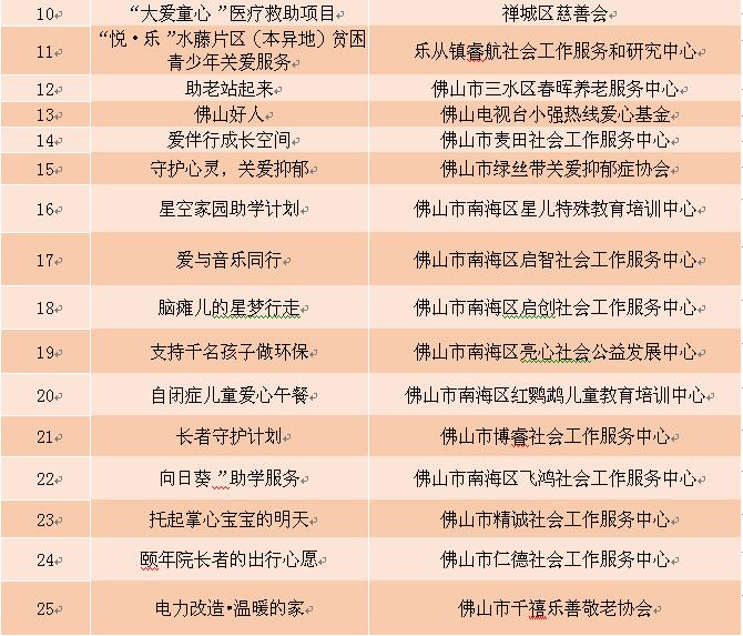 在公益小镇上,佛山五区34个公益慈善项目集体亮相进行项目展示和众筹,其中25个公益慈善项目在报名期间已经通过线上发起众筹,其中包括市慈善会11个创益合伙人计划项目、各区推荐的3个优秀公益项目和南海区慈善会种子库首批10个项目。线上众筹项目包括为贫困患病儿童筹集医药费、为自闭症儿童筹集爱心午餐、为贫困长者改善家居环境等内容,服务覆盖佛山五区,服务群体包括自闭症儿童、尿毒症患者、抑郁症患者、早产儿童、困难老人、异地务工人员、佛山好人和流浪动物等。单个项目目标筹款额度从0.66万元至50万元不等。