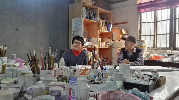 一張長桌,幾條椅,四面靠牆的架子上陳列著創作好的瓷器。在古典音樂的環繞中,一幅畫作擺開在關蘭的面前,中西美術文化碰撞後的“再造經典”便在這樣的環境下創作出來,談得投機她便起身取下架子上的瓷器請我們感受瓷面上微凸的花紋。