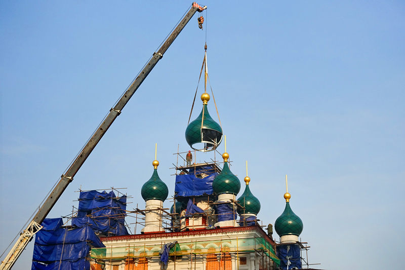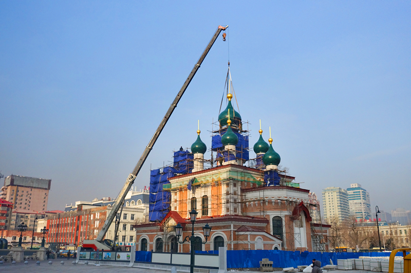 13日,记者上班途径此处,见到逐渐完善的哈尔滨火车站北广场教堂,工人们正在吊装教堂穹顶的“洋葱头”,标志着教堂的修建接近尾声。哈尔滨这座充满欧陆风情的城市,又增加了一处中西合璧的文化符号,哈尔滨正向颇具特色的国际大都市迈进。张晓磊、王成