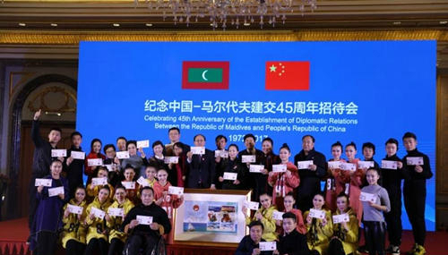 据了解,此次马尔代夫邮政发行的纪念邮票一套共6枚。图案分别为马尔代夫中马友谊大桥、中国福建平潭海峡公铁两用大桥、马尔代夫著名足球运动员阿什法克、中国著名女子乒乓球运动员丁宁和刘诗雯、马尔代夫传统风格民居以及中国黑龙江雪乡风光。中国外交部集邮协会与中国集邮总公司联合制作两国建交45周年纪念封一枚。全国人大常委会副委员长沈跃跃和马尔代夫总统亚明共同为“中国.马尔代夫建交45周年”纪念邮票、纪念封揭幕。这也标志着,雪乡将由 “国家名片”成功升级为“世界名片”。