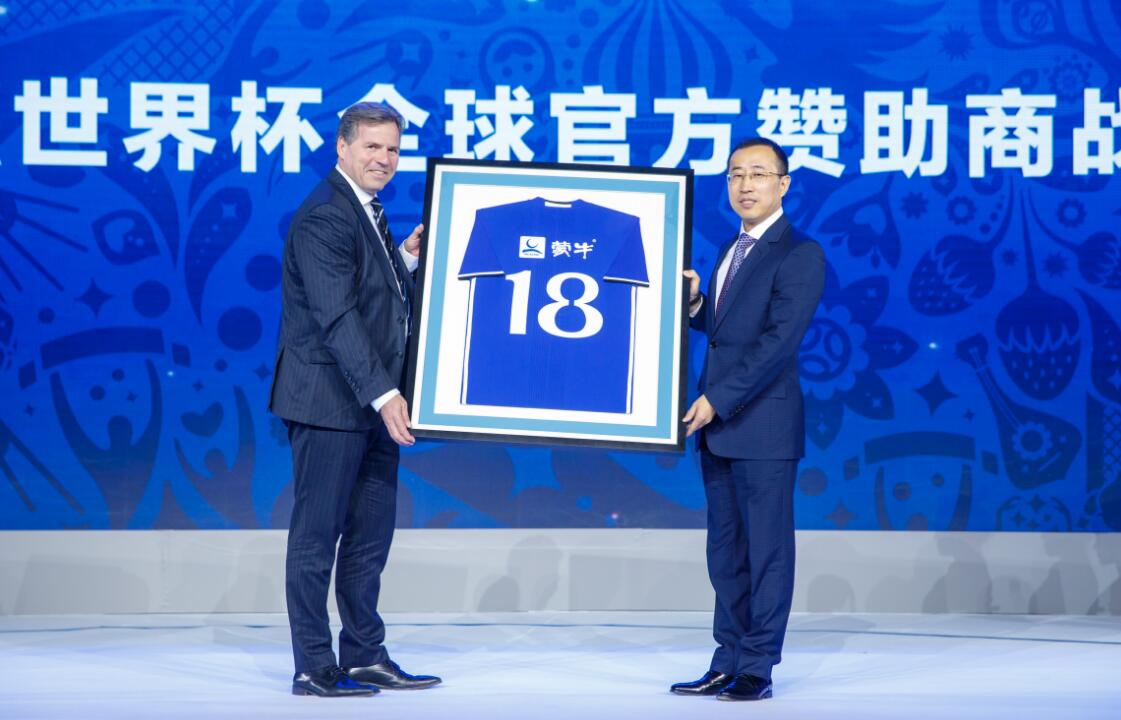 国际足联向蒙牛赠送象征2018世界杯的18号球衣