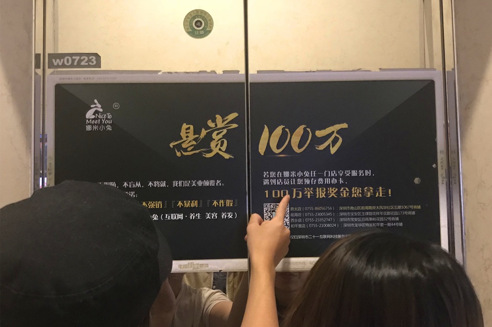 据深圳电视台都市频道12月19日的报道,娜米小兔悬赏100万让消费者举报向其推销办卡的员工。而此前的12月13日,该公司将此承诺发布到深圳各大社区及北环大道某处LED户外大屏。悬赏公告画面显示,娜米小兔自称新零售美业,专注互联网、养生、美容、养发,公开承诺“不办卡,不强销,不暴利,不作假”,如有消费者在店内消费时被店员推销办卡,举报后即可获得100万元奖励。