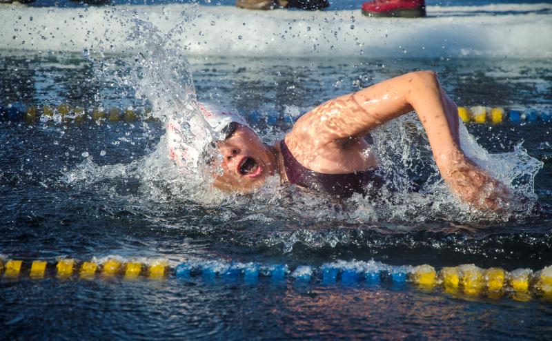 邀请赛现场,银装素裹的冰雪世界与湛蓝的天空完美相融,五颜六色的彩旗和大红灯笼飘荡在基地上空,桥下冬泳基地上室外温度达到零下29摄氏度,“泳士”们穿着薄薄的泳衣畅游在冰冷刺骨的河水中,一场场紧张而激烈的冬泳竞技赛吸引着越来越多的游客和市民前来观看。来自英国代表队的罗里说道:“我们家没有这么冷的天气,非常高兴能够中国,这的冰景太美了,我喜欢冬泳,在英国很难找到合适的地方,这的天也蓝,人也热情,就是太冷了,但是景色非常非常美,很奇妙,非常喜欢这里。”