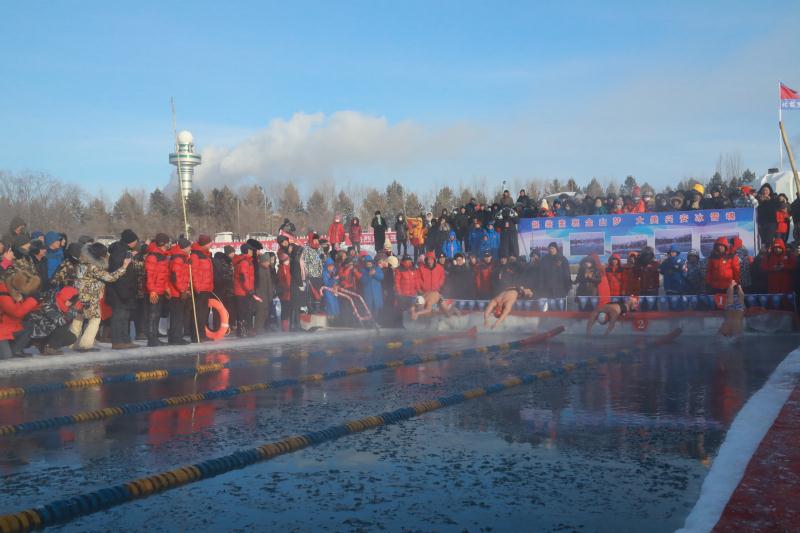 在甘河冬泳基地开幕式上,加格达奇区组织了3支120人的秧歌队、70人的学生迎宾鼓队、200人的学生雪地韵律操、120人的学生传统体育项目来展示优秀的传统冰雪文化运动,烘托气氛。在冬泳表演环节,黑河中俄水上联盟冬泳队、俄罗斯、美国和英国代表队上演了精彩的冬泳技艺表演。在冬泳竞赛环节,针对此次邀请赛参赛队伍多、参赛冬泳队员多、年龄差距大这一实际,科学设置了老年、中年、青年三个组别的自由泳、蛙泳、4﹡25米接力三个比赛项目,安排了一天的竞赛赛程,精心的安排、周密的组织、暖心的服务,不仅有效确保了整个冬泳赛程的顺利进行,也确保了广大冬泳运动员饱满的竞技状态,一项项成绩被刷新、一个个记录被打破,紧张而激烈的冬泳竞技赛,吸引着越来越多的游客和市民前来现场观看,为冰天雪地、极地冰河的兴安首府加格达奇增添了一道靓丽的风景线。广州东山冬泳运动员梁惠娴说道:“广州的水温最低就是8.9度吧,但是到了这里,零下30度,是我们这辈子都没经历过的,但是游完了以后,我们身体是热的,所以他们都觉得挺爽,很高兴。”