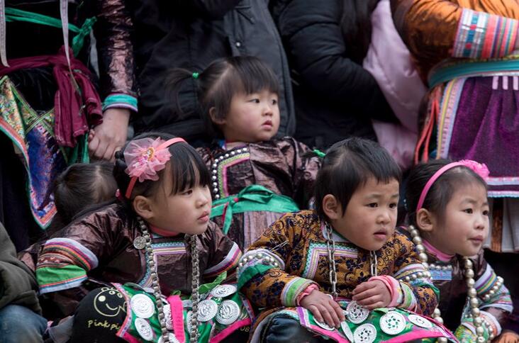 2018年1月5日,在贵州省从江县丙妹镇大塘村芦笙节上,苗族孩子在看芦笙。(吴德军摄)