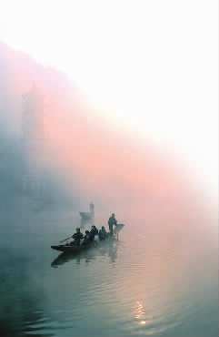 穿过雾霭的小舟,经过隐隐约约的白塔。
