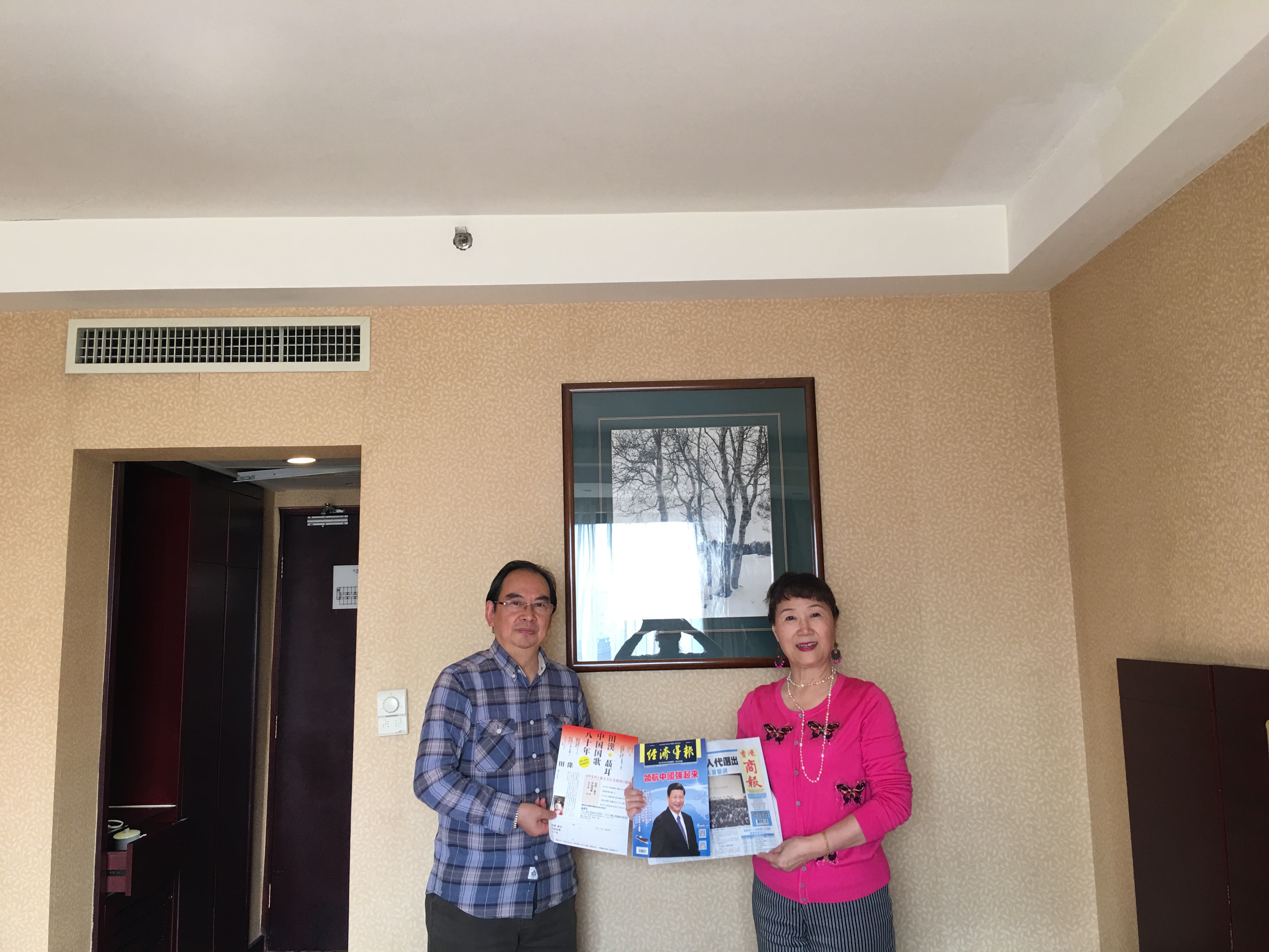 田伟与香港商报社长助理、香港经济导报副总编辑赵启东互赠香港商报、经济导报样刊及东方艺术团宣传专页,并合照留念。