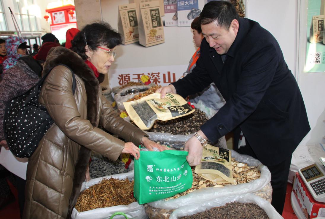 黑龙江天锦食用菌有限公司总经理高鹏为顾客装放商品。