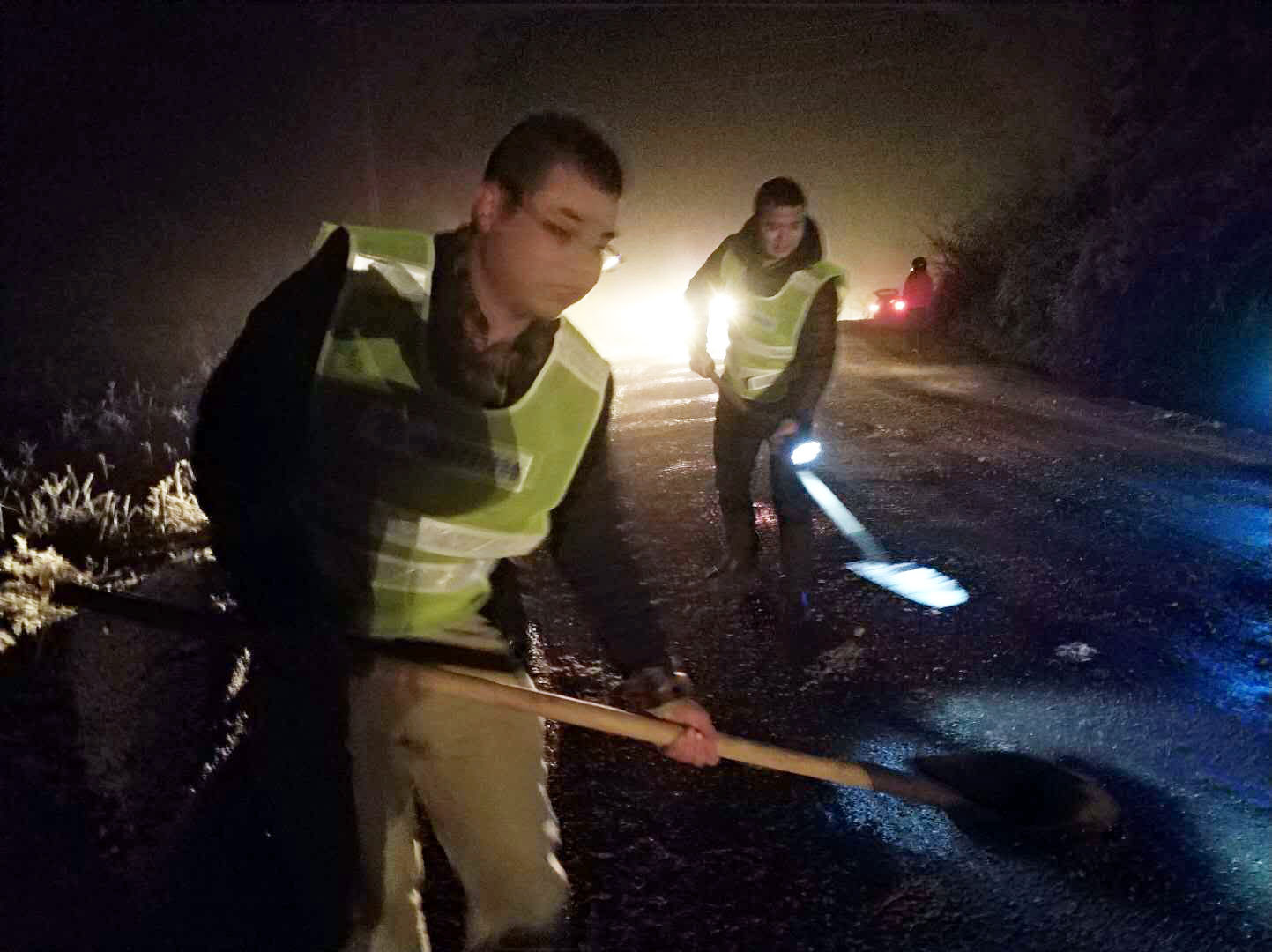 除冰现场,有的抛撒着洁白的工业盐,有的挥动着铁铲,铲除融化的碎冰,有的设置警示牌,有的巡查,看有没有滞留的车辆。宁静的寒夜里,只听见“哗啦——哗啦——”的铲沙声,夹杂着急促的喘气声,以及嗖嗖的冷风声。
