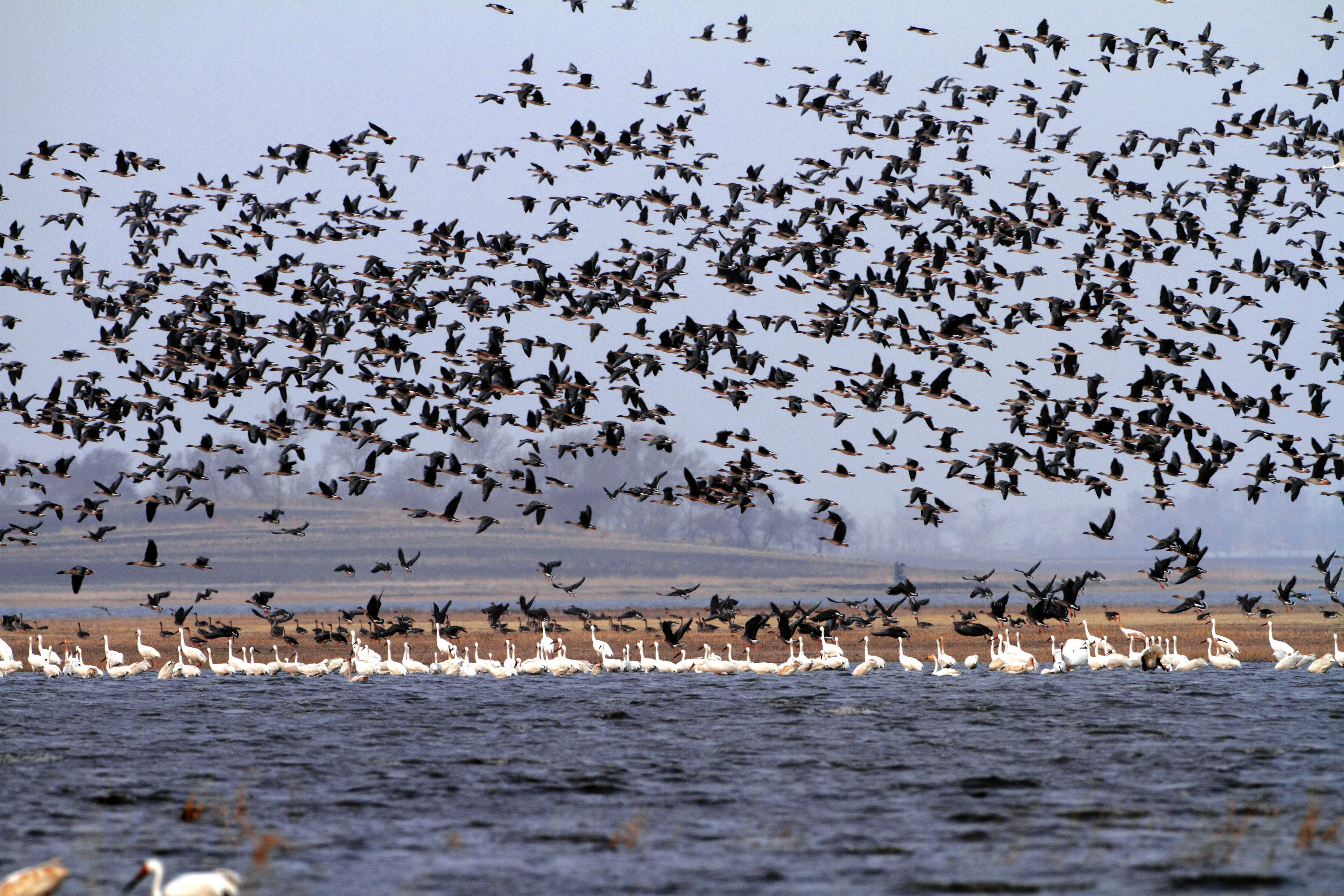 时值隆冬,在东洞庭湖采桑湖辽阔的湿地上,冬候鸟集结于此。透过望远镜,可以看到罗纹鸭静静浮在水面,长腿的反嘴鹬行走于浅水处觅食,远处大群雁鸭飞起,一瞬间形成一片鸟云……“到洞庭湖观鸟去”,吸引了无数来自国内外的观鸟队伍,来到东洞庭湖湿地,架起“长枪短跑”,一睹越冬水鸟的风采。
