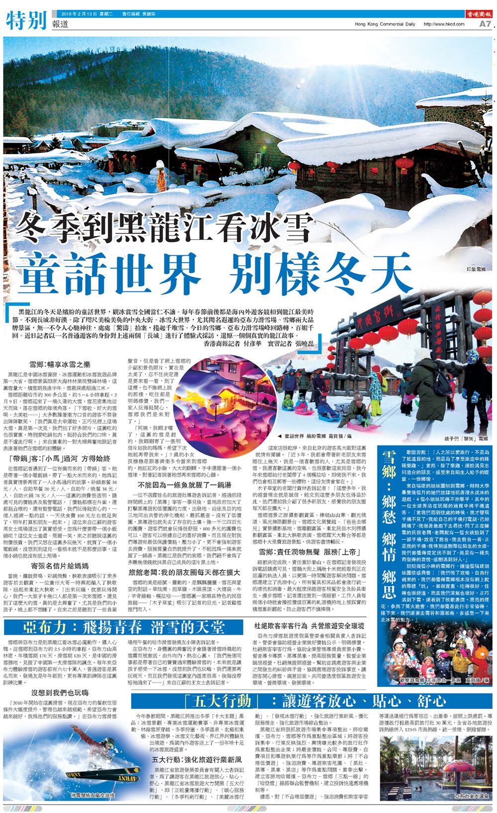 黑龙江省旅游发展委员会有关人士告诉记者,为了让游客在黑龙江旅游放心、贴心、舒心,黑龙江省冰雪旅游大力开展“五大行动”,即“正能量传播行动”、“暖心服务行动”、“冬季利剑行动”、“美丽冰雪行动”、“发现冰雪行动”,强化旅游行业新风、优化服务理念、强化旅游市场综合整治。