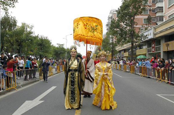 “皇族祭礼”方阵庄严华丽、规模宏大。皇族祭礼仪式是宋朝皇族赵氏的传统祭祖仪式,自公元960年宋太祖赵匡胤建立宋皇朝起,距今已有长达1055年的历史。经斗门区非物质文化遗产保护中心的多次整理、完善、创编,该项目于2016年被列入省级非物质文化遗产名录。该方阵由旗手、灯笼手、开道员、锣手、皇爷皇妃、撑罗伞人、三牲、宫女、祭司、文武官、舞姬、书生、新郎、新娘构成,演员人数近200人。和历届巡游相比,该方阵在原有78名演员的基础上,增加20名旗手和20名灯笼手,新郎、新娘共40人扩大方阵阵容,重新设计和制作音乐,将方阵介绍和祭词融入音乐之中,充分体现整个皇族婚礼的庄严感和仪式感,生动再现了宋皇族后裔婚礼祭祖的盛大场景,充分体现了整个皇族祭礼的庄严感、仪式感和喜庆感,再现了昔日皇家气派。