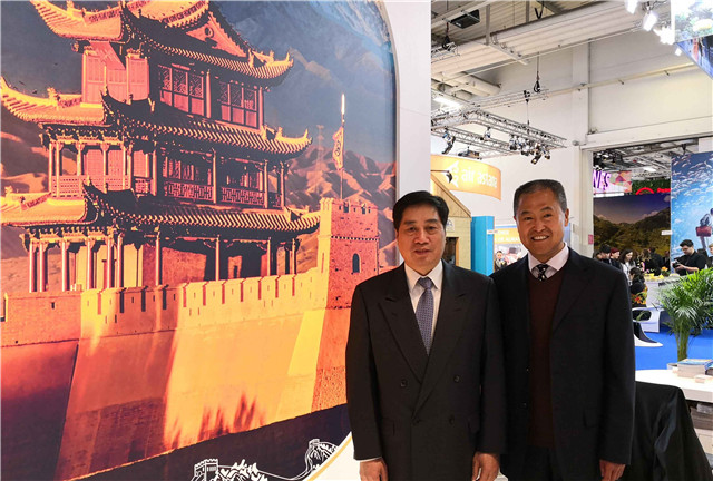 世界旅游组织执行主任祝善忠视察甘肃展位并与甘肃省旅游发展委员会副主任火玉龙合影。