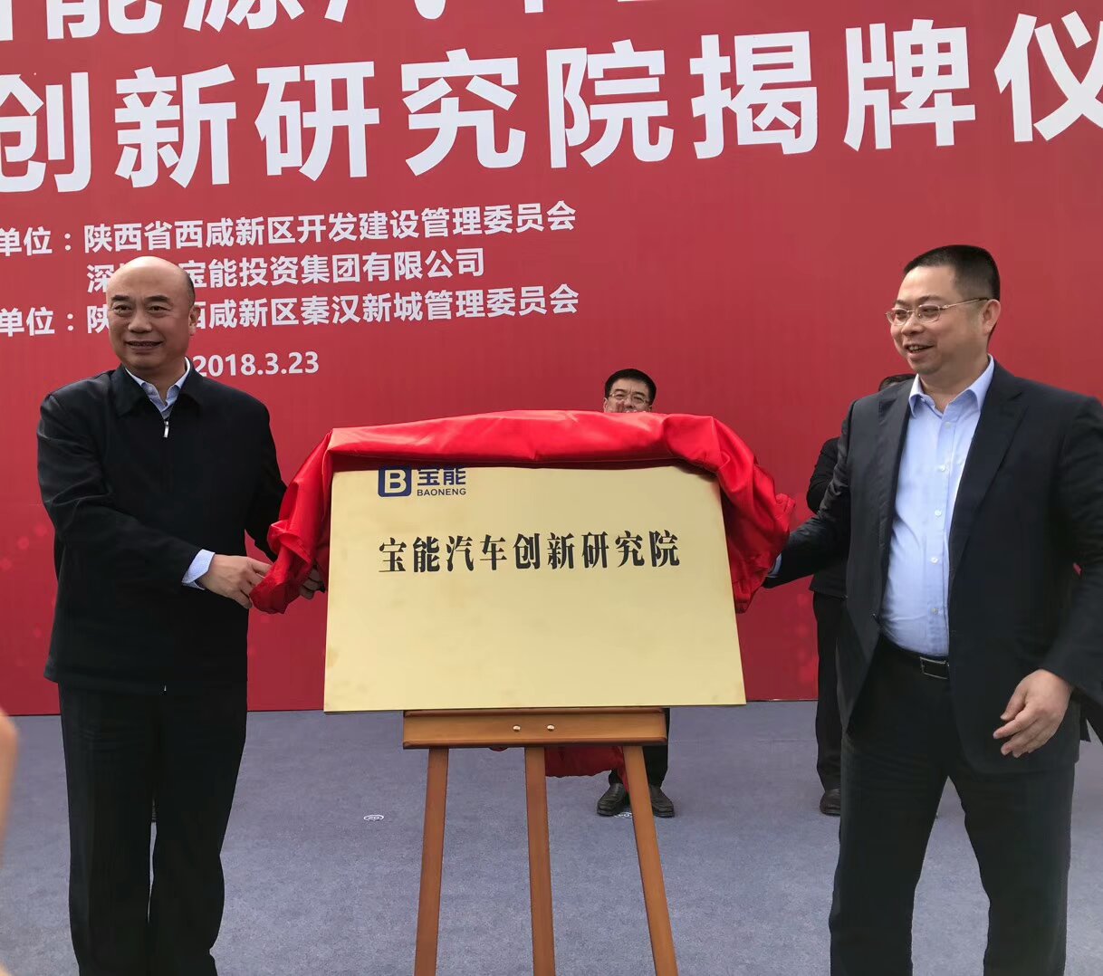 陕西省省长刘国中(左)和宝能集团董事长姚振华(右)共同为宝能汽车创新研究院揭牌
