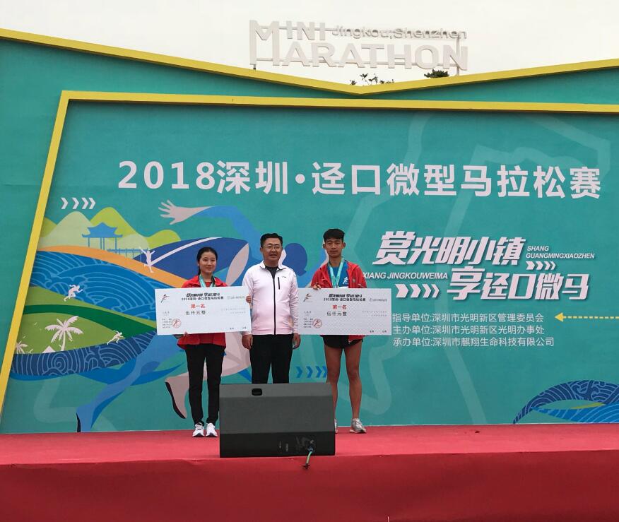右为男子冠军徐统帅(A0035)0:40:44,左为女子冠军宋璇(A2031)0:47:44,中间为颁奖嘉宾光明新区党工委书记王宏彬(黄凤鸣拍摄)。