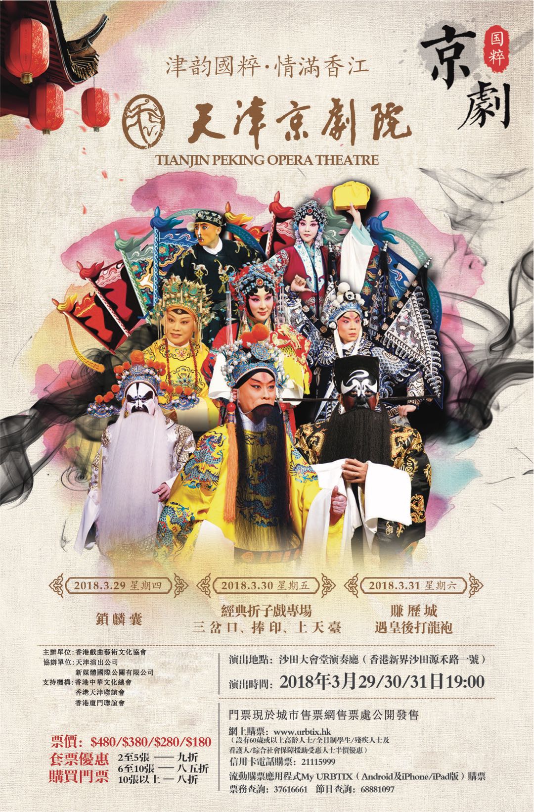 天津京剧院将于2018年3月29日、30日、31日,在香港沙田大会堂演奏厅演出多场传统京剧精典剧目 。节目表具体为:29日《锁麟囊》,主演吕洋;30日《三岔口》,由王大兴 、韩岩松联袂上演;30日《捧 印》,由曹馨月、李 宏联袂上演;30日《上天台》,由王平、邓沐玮 联袂上演;31日《赚历城》,由王大兴主演 ;31日《遇后龙袍》,由康万生、李宏联袂上演。