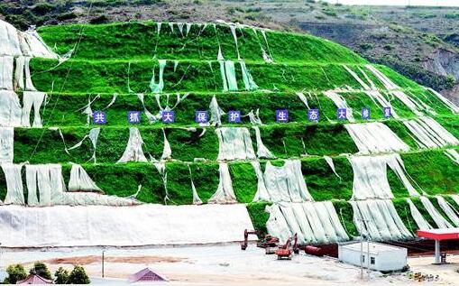 图为:3月28日,工人正在十堰市郧阳区杨溪铺镇山沙场进行高压喷涂混合土和草种作业,以修复矿山山体生态环境。生态修复以边坡覆绿草、网挂攀援植物、坡体挂攀三种方式进行,计划7年完成。(视界网 周家山 摄)