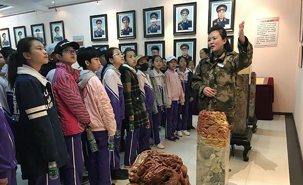 栩栩如生的靺鞨绣将军画像,威严挺立的铜造雕塑,一幅幅沉重有力的将军字迹……哈尔滨三五将军文化博物馆内的收藏和陈设将学生们带到那些抛头颅洒热血的将士们身边。800名学生在讲解员的带领下分成四个方队,依次走进哈尔滨将军文化博物馆和国防文化博物馆。馆内有将军艺术、开国将帅、将帅风采、士兵与老红军等几个展庁,分别从工艺美术、肖像文字、书法影像、生活物品等不同的视角进行展示。