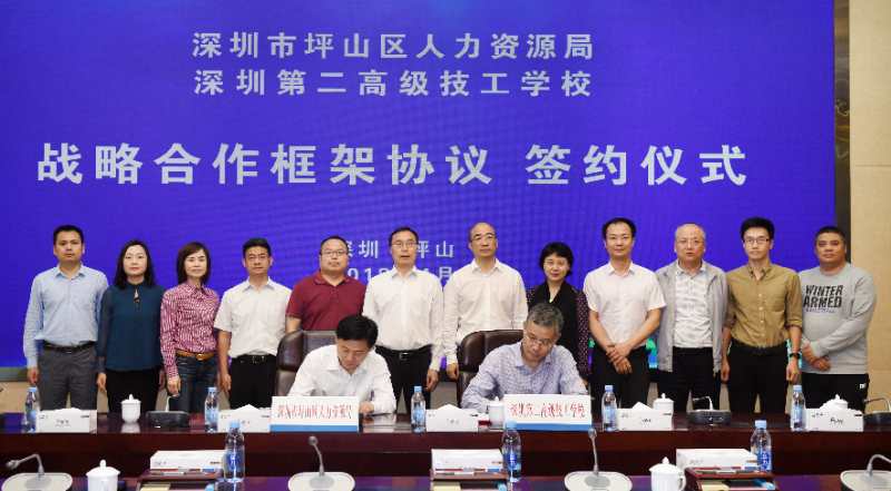 【香港商报网讯】记者焦家志 通讯员石志飞报道 :4月4日上午,深圳市坪山区人力资源局与深圳第二高级技工学校签订战略合作框架协议,双方将依据各自优势实现政校联合,携手推进坪山工匠园建设。市人力资源和社会保障局党组成员、副局长赵忠良以及职业能力建设处、技能鉴定办、高训中心等处室负责人,坪山区委常委、区政府党组成员林良沛,区人力资源局局长杨洲杰、副局长陈蓝蓝,市第二高级技工学校副校长罗德超等出席签约仪式。