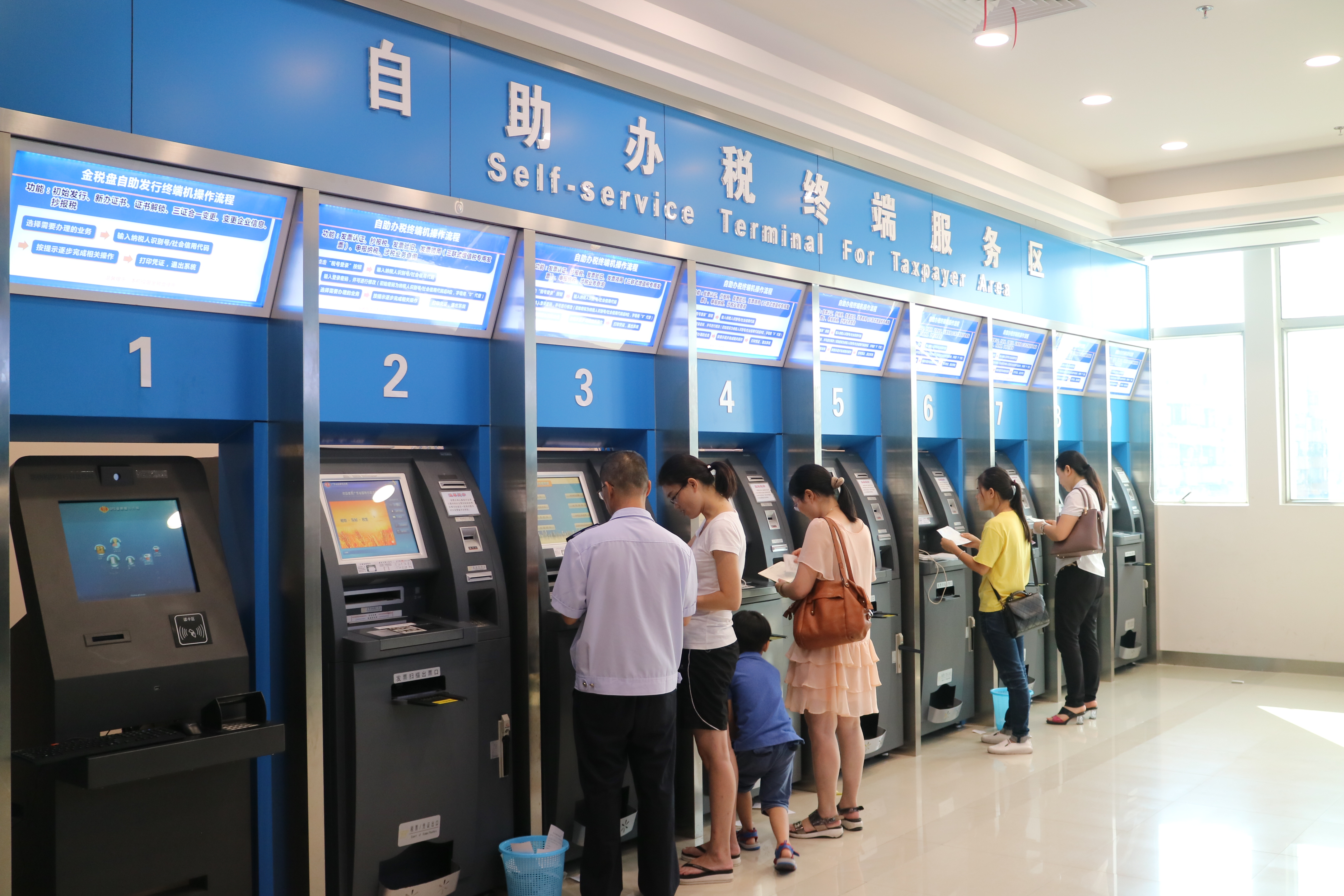 蓬江区国税地税联合办税服务厅,江门税务人员辅导纳税人使用自助办税终端办理涉税业务。
