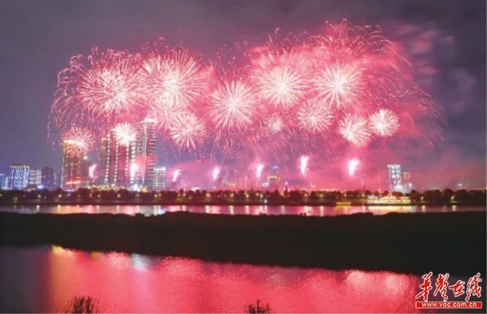 5月1日,绚丽的焰火给星城增添了节日的喜庆。当晚,长沙市在橘子洲景区举行“播种新希望”主题焰火燃放活动,焰火分《人杰地灵》、《智慧创新》、《耕耘奋进》、《收获芬芳》四个篇章,致敬广大劳动者。 记者 李健 摄