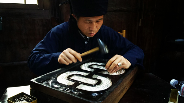 “你这个钉子要沿着这上面的图案再打打,那样才好看,慢点不着急。”45岁的李仕将正指导游客体验制作银饰。