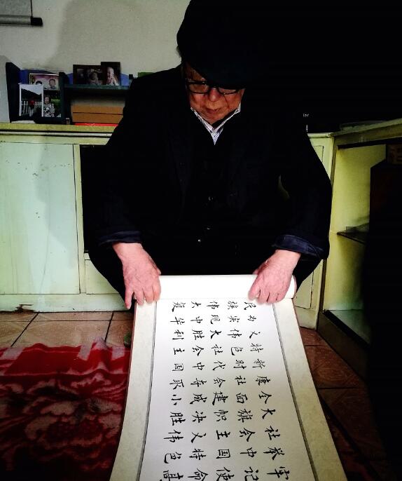 2017年10月18日,党的十九大在北京胜利召开,全国各地掀起了学习十九大的热潮。怀着对党的一片赤诚之心,刘源泉老人决定,用他所热爱的书法抄写党的十九大报告全文。从2017年11月20日到今年的3月28日,刘老历时5个月,完成了整整40余米、3万余字的《十九大报告》全文,字字工整、笔劲苍遒,无一删改。他用书法艺术表达了他“不忘初心,永远跟党走”的坚定决心。“作为一个共产党员来说,对于党的文献我有学习的义务和职责。再一个,作为一个艺术家来说,我就是要通过一个艺术的形式来传承我们党的精神,来歌颂习主席、歌颂中国共产党。”