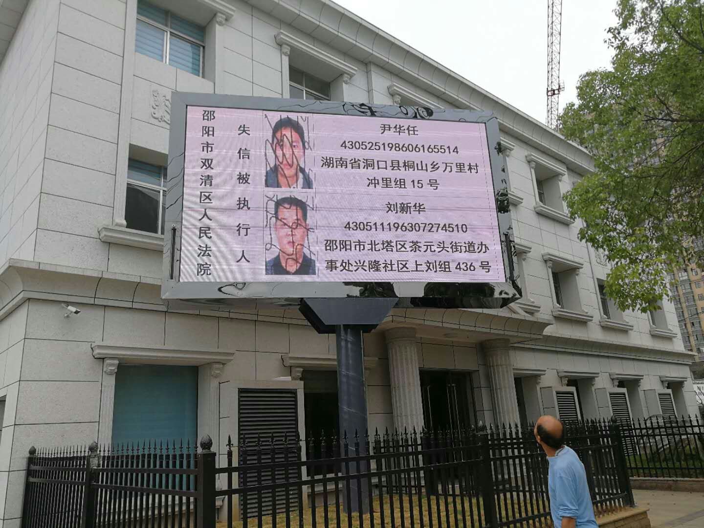 为保障广大群众的合法权益,维护法律权威和尊严,双清法院不断探索高效率执行,采取多种措施,加大执行力度,让“老赖”无处遁形。4月26日早上,邵阳市双清区人民法院公开曝光25名失信被执行人名单,长期坚持每天早上8时至晚上22时在大型电子显示屏不间断循环播放“老赖”名单,对失信被执行人名单将不定期更换。公布的被执行人因存在有履行能力而拒不履行、违反财产报告制度等失信情形而被列上了失信被执行人名单,公布失信被执行人名单,包括姓名、照片、身份证号、住址、单位等信息。按照有关法律规定,纳入失信被执行人名单将禁止其乘坐飞机、高铁和投资信贷、招投标、土地交易和担任特定职务等,使老赖“一处失信、处处受限”。