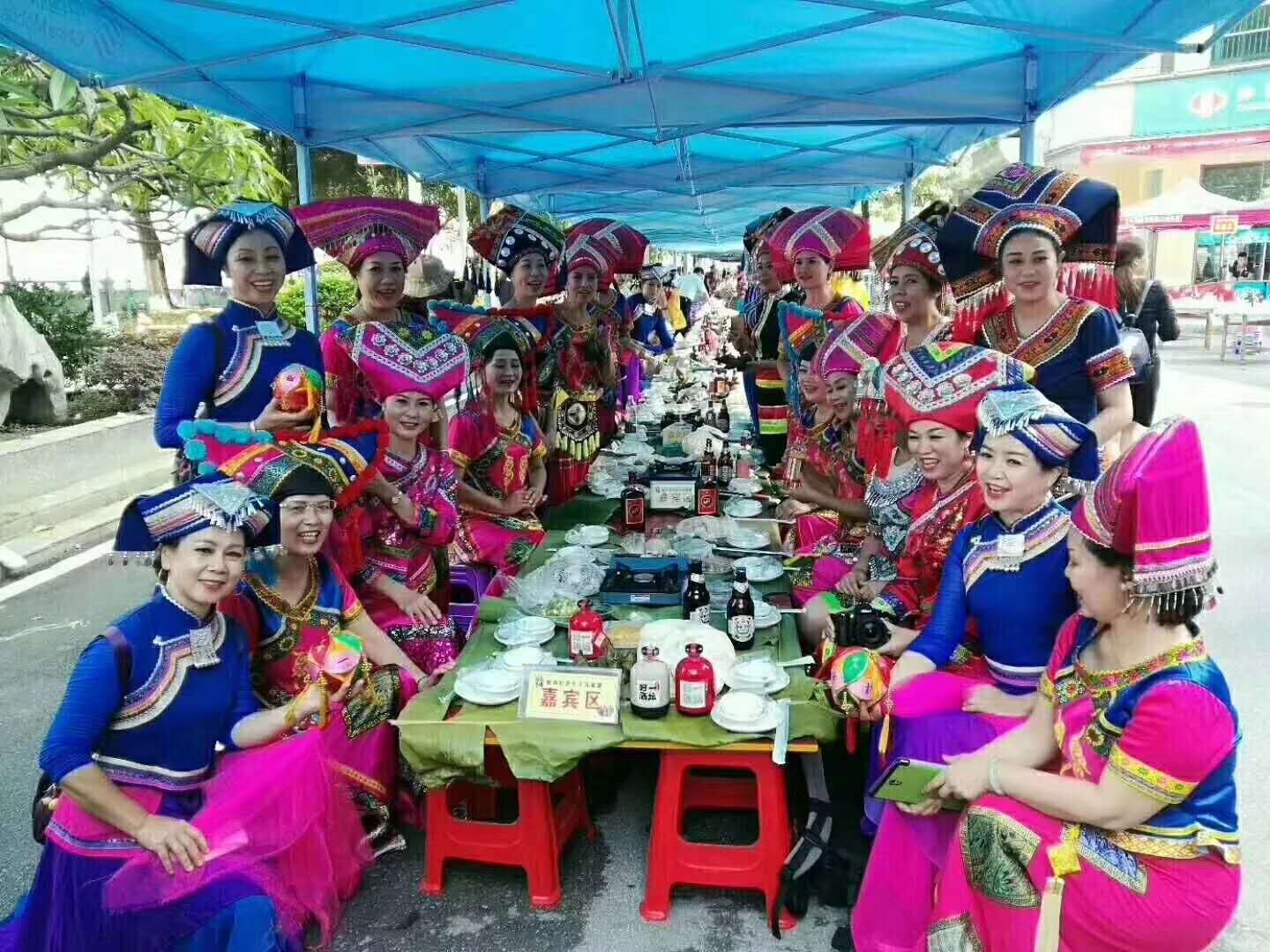此外,在每年舊曆的壯族三月三“吼敢”期間,田林的壯族群眾自發性的以田林“長桌宴”也叫“百家宴”作為集體待客習俗和最高禮儀。田林縣樂裏鎮的新昌、河南、新市3個社區在樂裏河畔擺設三百多桌長桌宴,圍坐近4000人,長桌宴至今仍保持著原生態的習俗。