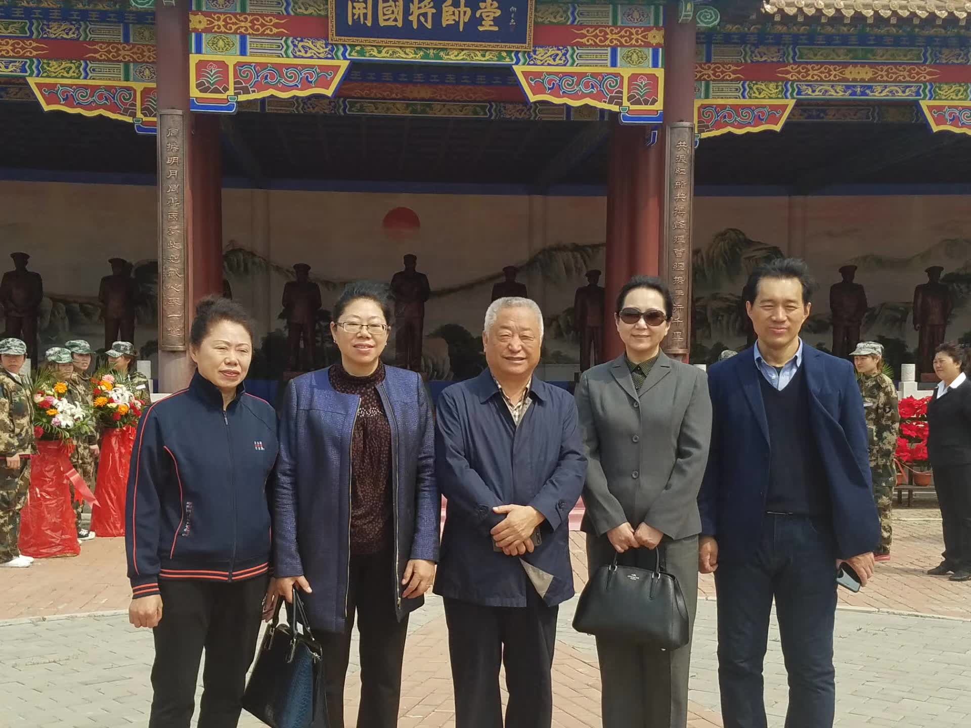 杨福荣(左一)、杨福芝(左二)与三五国防文化博物馆馆长王军(中间)在开国将帅堂前合影
