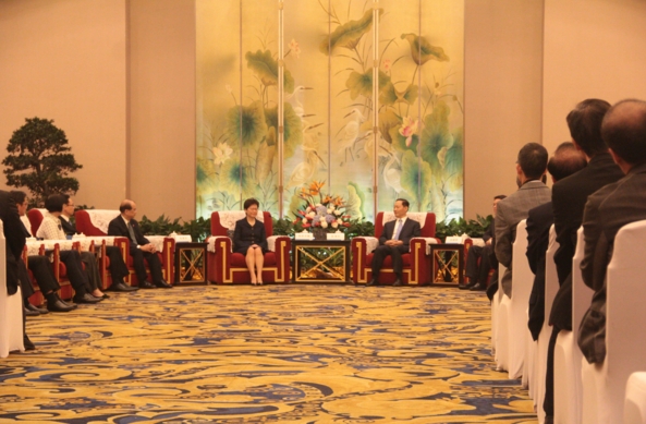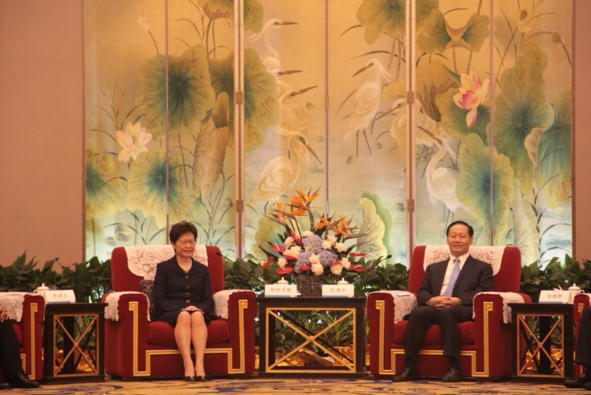 香港特区代表团与四川省主要领导在世纪城国际会议中心天府厅举行会见。国务院港澳办主任张晓明、香港中联办主任王志民出席会议。