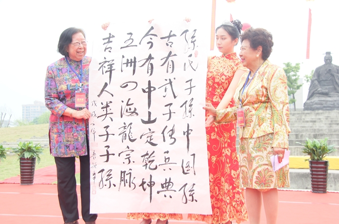 爱新觉罗世家、首都师范大学教授普颖华女士给孙中山先生孙女孙穗芳博士赠送孙武与孙中山诗词书法