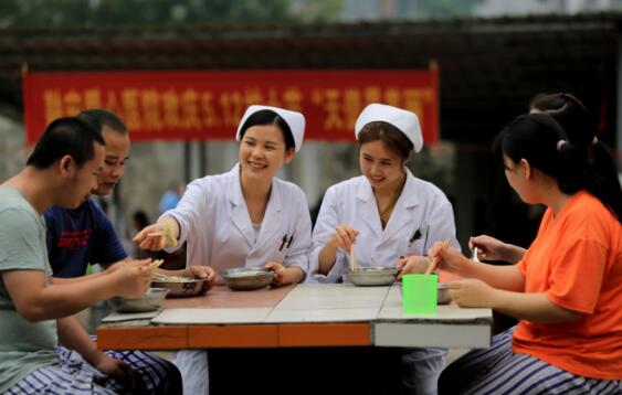 5月12日,在广西柳州市融安爱心医院,护士黄其雷(左)、李云子(右)与患者一起吃饺子。覃庆和摄