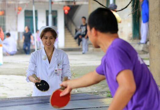 5月12日,在广西柳州市融安爱心医院,护士李云子与一位患者在打乒乓球。