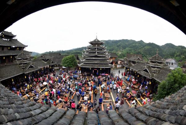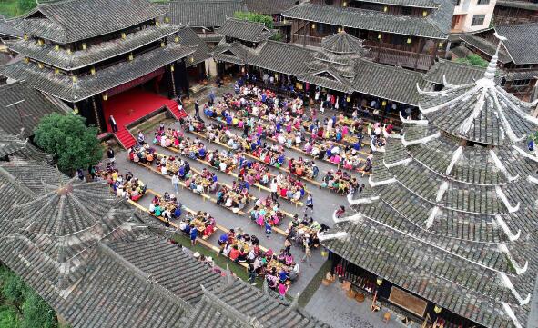 5月12日,人们在三江侗族自治县林溪镇冠洞村冠小侗寨共进百家宴。