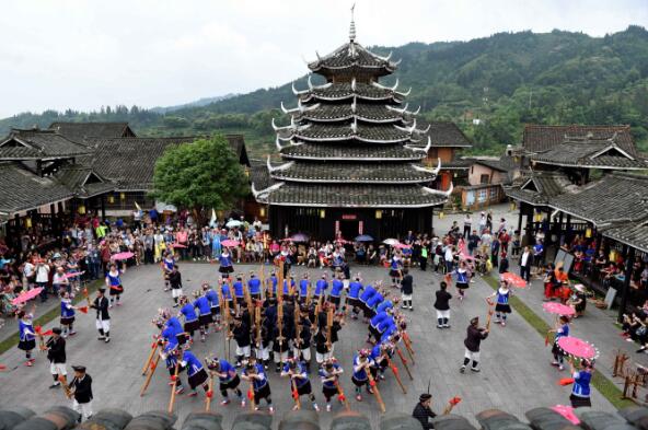 5月12日,人们在三江侗族自治县林溪镇冠洞村冠小侗寨表演芦笙踩堂。