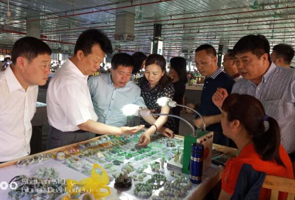 大兴安岭地委委员、宣传部部长刘洪久(左二)与大兴安岭地委宣传部常务副部长谭俊(左三)调研四会市玉器市场