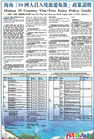 For the 59 country visa free entry,you must be registered with a Hainan travel agency to enjoy visa free entry to Hainan, and the travel agency must submit your information to the Exit-Entry Administration Bureau of Hainan 24 hours before you arrive. For a smooth trip, we recommend that you submit your passport and round trip tick-et information to the travel agency at least 48 hours before arrival.