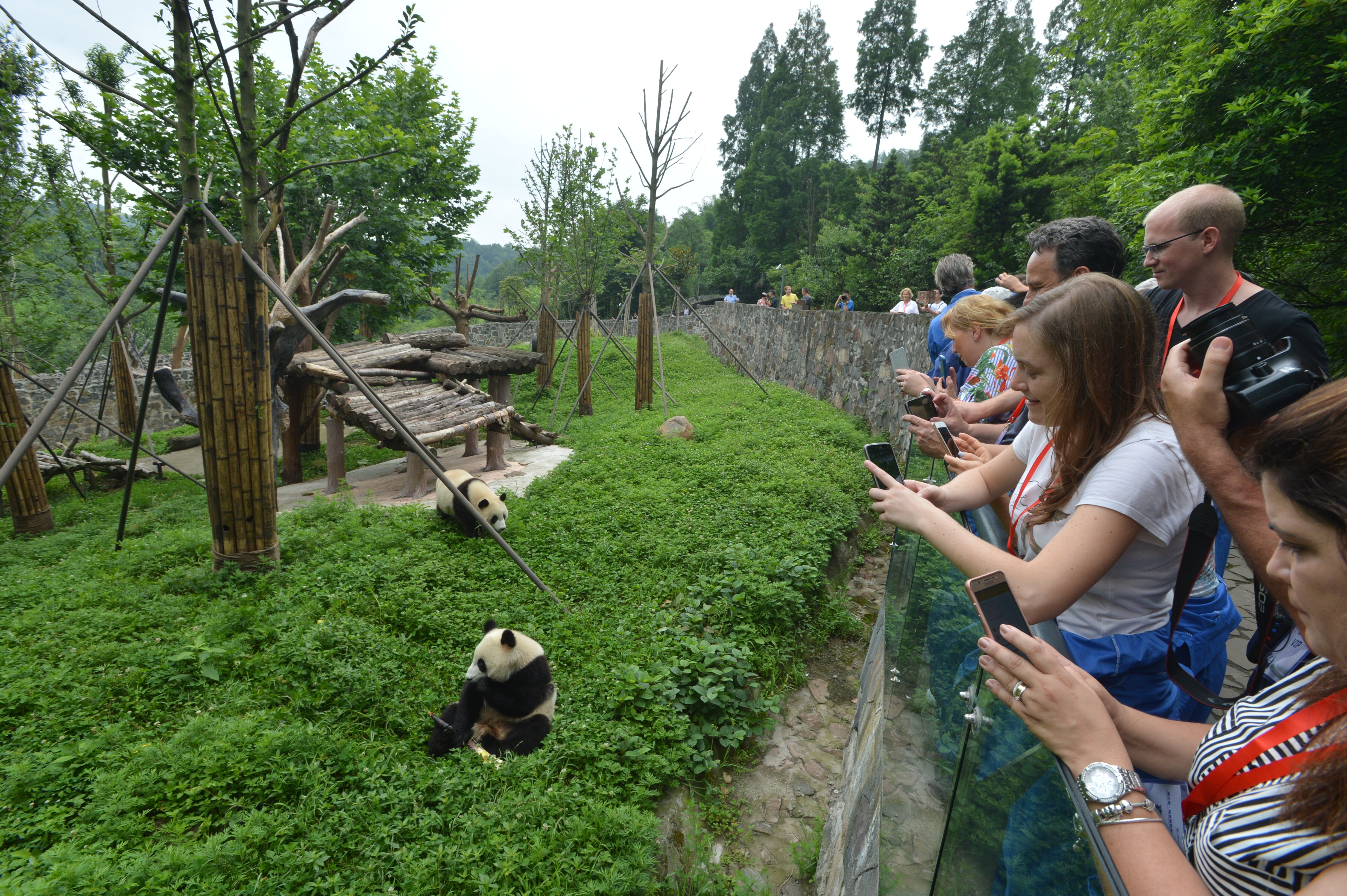 【香港商报网讯】記者郭代勤報道:6月13日,來自德國、英國、澳大利亞、美國、法國、西班牙、阿根廷等16個入境旅遊客源國的近50家途易旅行商、100餘名代表參觀了中國大熊貓保護研究中心都江堰基地,紛紛被大熊貓“圈粉”,還當起了“大熊貓志願者”,為它們打掃籠舍,並紛紛對萌寶的“口糧”——竹子進行了愛心認養,親手寫下自己的祝福。
