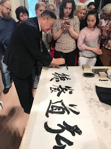 【香港商报网讯】国之交在于民相亲 民相亲在于心相通。优秀文化交流是心相通的最好催化剂 。5月16日,中国艺术研究院艺术创作院特聘研究员、黑龙江省政协书画院院长赵学礼作为创作人之一的书法插画版《道德经》在莫斯科中国文化中心举办首发式,俄罗斯文化界知名人士华冠云集,学术交流氛围浓厚,赵学礼即兴现场挥毫泼墨,大咖们纷纷点赞,首发仪式在俄掀起了“需求热”,成为饮誉华夏、中俄文化交融典范力作。